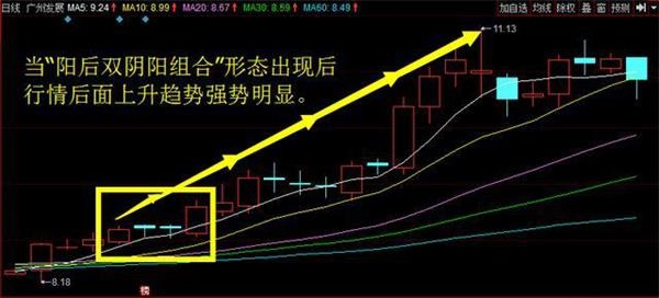 今天来介绍“阳后双阴阳组合K线形态”。 如图中所示,一根大阳线后接着收两根阴线,然后又是一根大阳线,注意后面的一根大阳线要求要高于第二根阴线的最高点,会接近最高点 ...