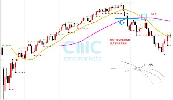 再看图中,在实际应用中,往往一个关键价格的下破,其信号的优势会大于MA(死叉)信号,这是一个技巧。